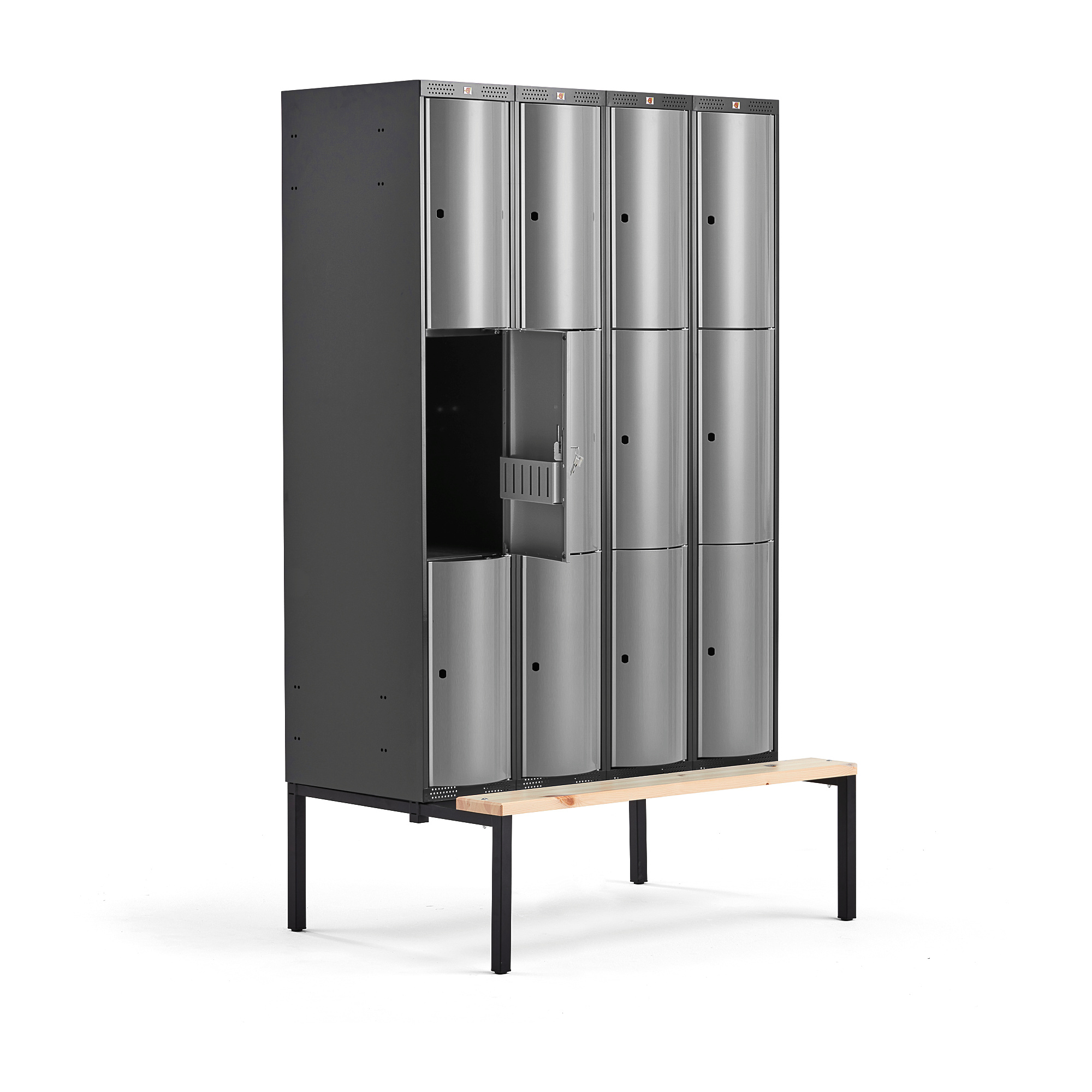 Strona główna » Szafki Fitness » Szafy » Szafki osobiste » Metalowa Szafa Ubraniowa Curve, Z ławeczką, 4x3 Drzwi, 2120x1200x550 Mm, Szary