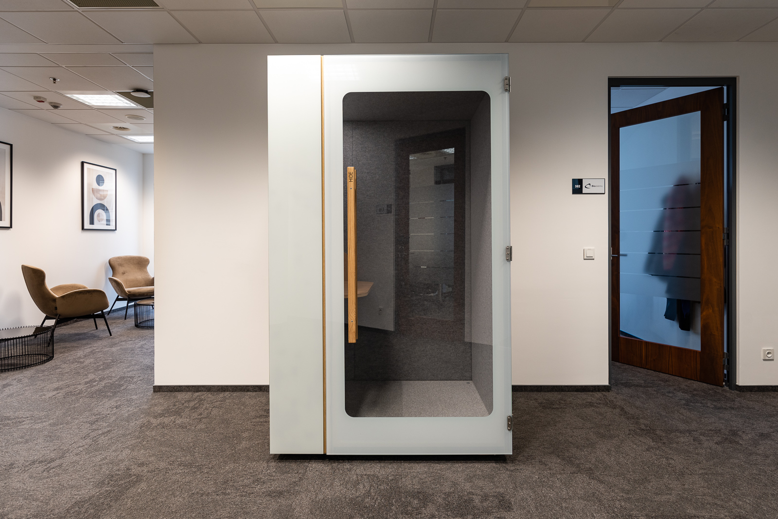 Funkcjonalne wyposażenie - Na standardowe wyposażenie każdej kabiny akustycznej HIDE składają się: oświetlenie włączane na czujnik ruchu, gniazda elektryczne 230 V, USB oraz regulator mocy nawiewu.
