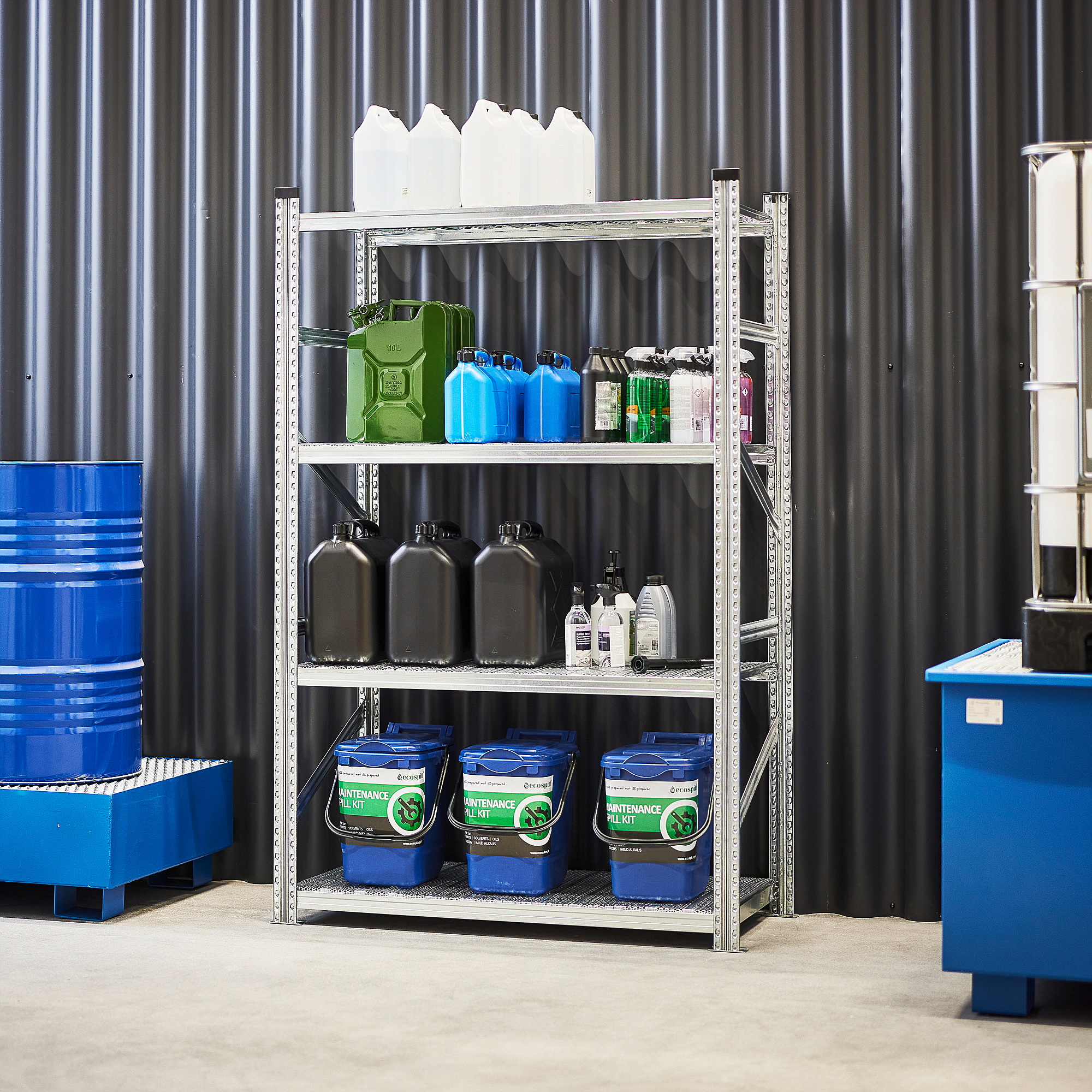 Strona główna » Przemysł i magazyn » Systemy magazynowania » Regały sklepowe » Regał Na Chemikalia, Moduł Podstawowy, Z Tacą Wychwytową, 1972x1200x600 Mm, 29 L
